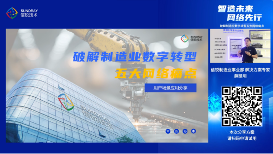 11月13日,信锐成功举办“破解制造业数字转型五大网络痛点”主题直播。本次直播深度聚焦制造业在园区、生产、仓储、办公、分支五大场景下面临的网络挑战,全面展示了信锐“五网双联”创新解决方案。